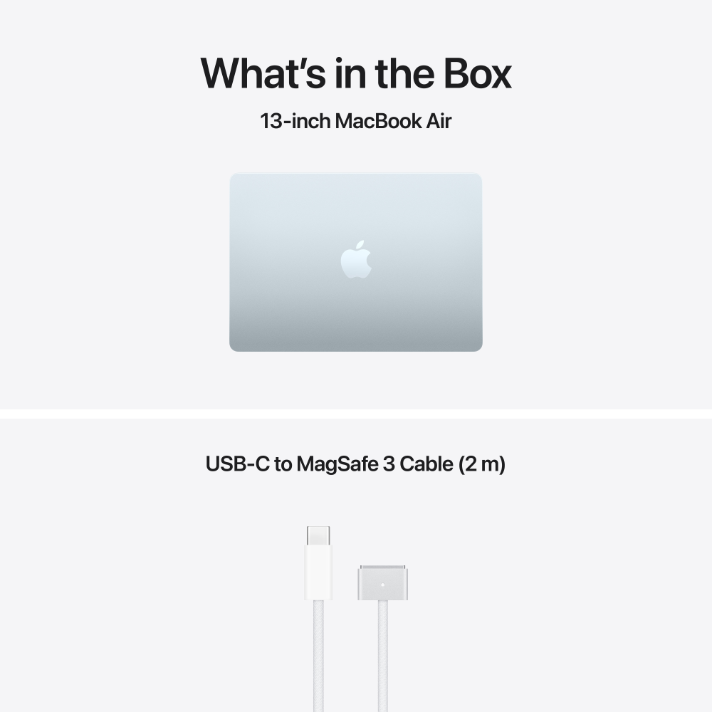 • STRÖMADAPTRAR – OBS! MacBook Air (13 tum) levereras med en usb-c till MagSafe 3-laddningskabel, men utan strömadapter. För att ladda datorn krävs en usb-c-strömadapter eller annan usb PD-strömkälla med en uteffekt på minst 30 W. För optimal laddning av den här Mac-modellen rekommenderas Apples usb-c-strömadapter på 30 W eller 70 W (den senare fungerar med snabbladdning – upp till 50 % på 30 minuter).