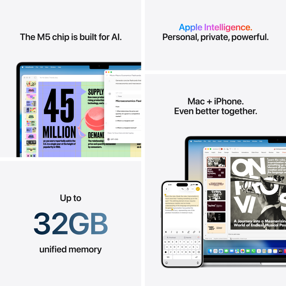 • SUPERLADDAD MED M5 – Förutom snabbare processor och enhetligt minne ger M5 även högre prestanda och förbättrad följsamhet i appar, vilket gör multitasking och kreativa arbetsflöden smidiga och responsiva. En kraftfull Neural Engine och senaste generationens grafikprocessor med Neural Accelerators ger massor av kraft för AI.