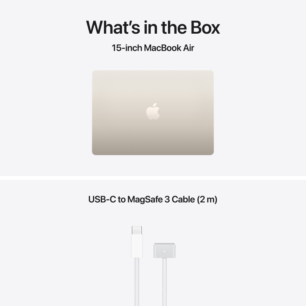 • STRÖMADAPTRAR – OBS! MacBook Air (15 tum) levereras med en usb-c till MagSafe 3-laddningskabel, men utan strömadapter. För att ladda datorn krävs en usb-c-strömadapter eller annan usb PD-strömkälla med en uteffekt på minst 35 W. För optimal laddning av den här Mac-modellen rekommenderas Apples usb-c-strömadapter på 35 W med två portar eller Apples usb-c-strömadapter på 70 W (den senare fungerar med snabbladdning – upp till 50 % på 35 minuter).