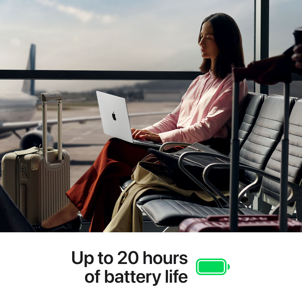 Testerna utfördes av Apple i januari och februari 2026 med förhandsversioner av 14-tums MacBook Pro med Apple M5 Max, 18-kärnig processor, 32-kärnig grafik, 36 GB enhetligt minne och 2 TB SSD samt 14-tums MacBook Pro med Apple M5 Pro, 18-kärnig processor, 20-kärnig grafik, 24 GB enhetligt minne och 2 TB SSD. Batteritid vid trådlös internetanslutning testades genom att surfa på 25 populära webbsidor med wifi-anslutning. Batteritid vid videostreaming testades med innehåll i 1080p i Safari med wifi-anslutning. Bildskärmens ljusstyrka var inställd på åtta steg från den lägsta nivån och bakbelysningen för tangentbordet var avstängd. Batteritiden varierar beroende på användning och konfiguration. Mer information hittar du på apple.com/se/batteries.