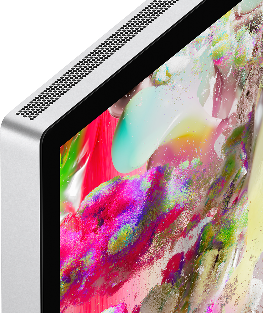 Studio Display har även tre mikrofoner av proffskvalitet, med extra lågt brusgolv för kristallklart ljud vid samtal och röstinspelningar. Den har även ett hifi-system med sex högtalare, det bästa ljudsystemet som någonsin skapats för Mac, som ger en helt suverän ljudupplevelse. Systemet består av fyra kraftutjämnande baselement som minimerar distorsion och producerar en distinkt, välartikulerad bas samt två avancerade diskanthögtalare som återger mellan- och diskantregister klart och korrekt. Högtalarna har även stöd för rumsligt ljud för musik och video med Dolby Atmos, vilket ger en verkligt filmisk upplevelse. Kort sagt, Studio Display har den bästa kombinationen av kamera och ljud någonsin i en datorskärm.