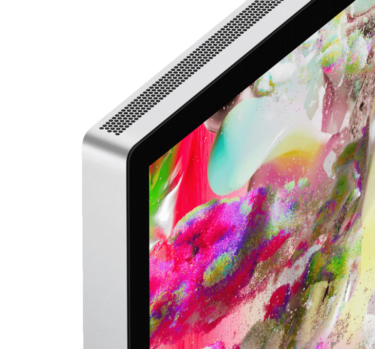 Studio Display har även tre mikrofoner av proffskvalitet, med extra lågt brusgolv för kristallklart ljud vid samtal och röstinspelningar. Den har även ett hifi-system med sex högtalare, det bästa ljudsystemet som någonsin skapats för Mac, som ger en helt suverän ljudupplevelse. Systemet består av fyra kraftutjämnande baselement som minimerar distorsion och producerar en distinkt, välartikulerad bas samt två avancerade diskanthögtalare som återger mellan- och diskantregister klart och korrekt. Högtalarna har även stöd för rumsligt ljud för musik och video med Dolby Atmos, vilket ger en verkligt filmisk upplevelse. Kort sagt, Studio Display har den bästa kombinationen av kamera och ljud någonsin i en datorskärm.