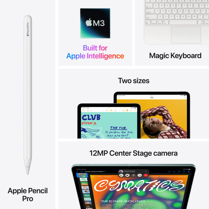 • APPLE PENCIL OCH MAGIC KEYBOARD – Apple Pencil Pro förvandlar iPad Air till en inbjudande målarduk och världens bästa verktyg för anteckningar. Apple Pencil (USB-C) fungerar också med iPad Air. Magic Keyboard till iPad Air är suveränt att skriva på. Det har en inbyggd styrplatta, en rad med 14 funktionstangenter och fungerar även som ett skydd för enheten. Tillbehör säljs separat.