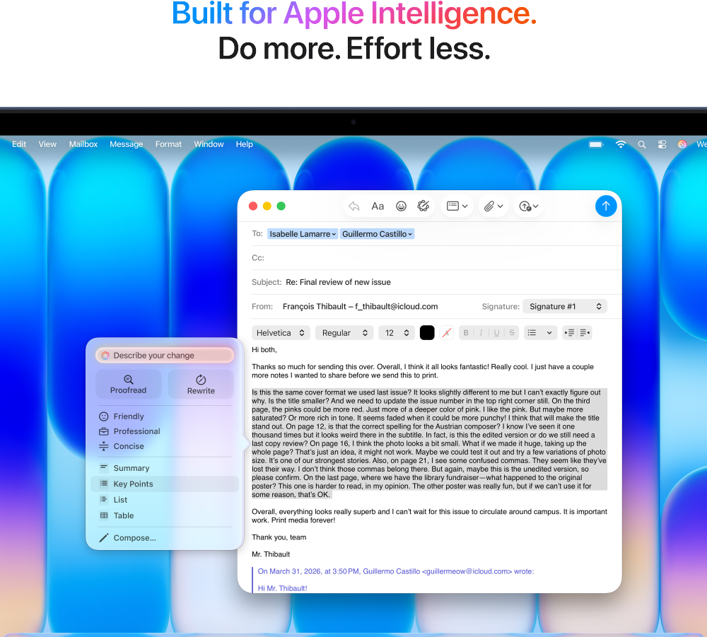 • BYGGD FÖR AI – Apple-chippet och alla de viktiga komponenter som driver det har utformats att köra AI-funktioner effektivt på enheten. Och Apple Intelligence hjälper dig att skriva, uttrycka dig och få saker gjorda på ett enklare sätt – med banbrytande integritetsskydd i varje steg.2