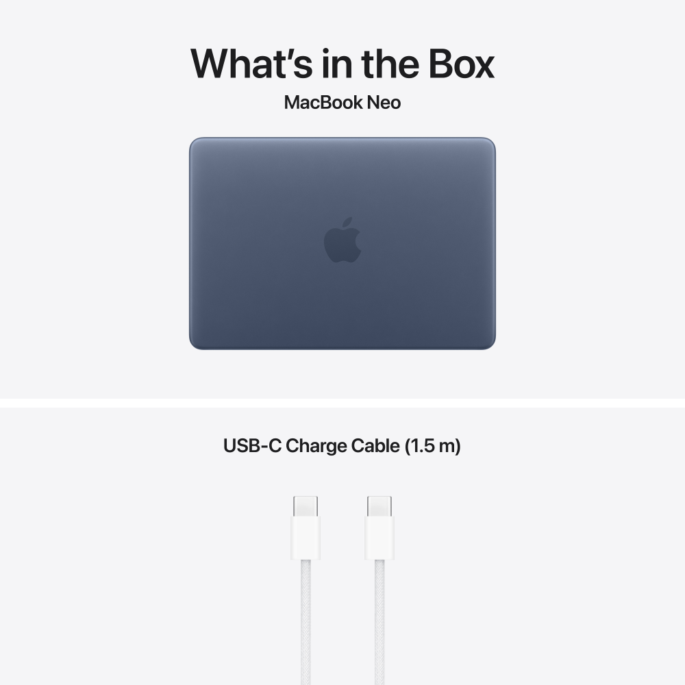 • STRÖMADAPTRAR – OBS! MacBook Neo levereras med en usb-c-laddningskabel, men utan strömadapter. För att ladda datorn krävs en usb-c-strömadapter eller annan usb PD-strömkälla med en uteffekt på minst 20 W. För optimal laddning av den här Mac-modellen rekommenderas Apples usb-c-strömadapter på 20 W.