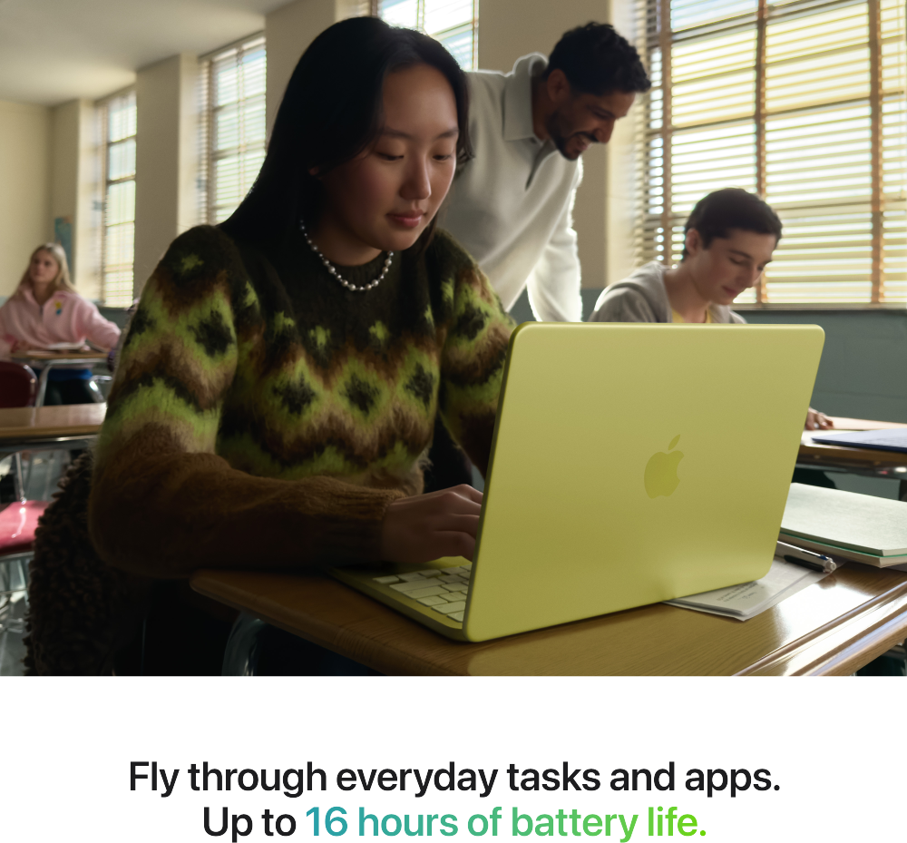 • UPP TILL 16 TIMMARS BATTERITID – MacBook Neo har ett batteri som räcker hela dagen. Den kan följa med dig överallt i vardagen eller i studierna – från tidiga morgonlektioner till sena pluggkvällar.