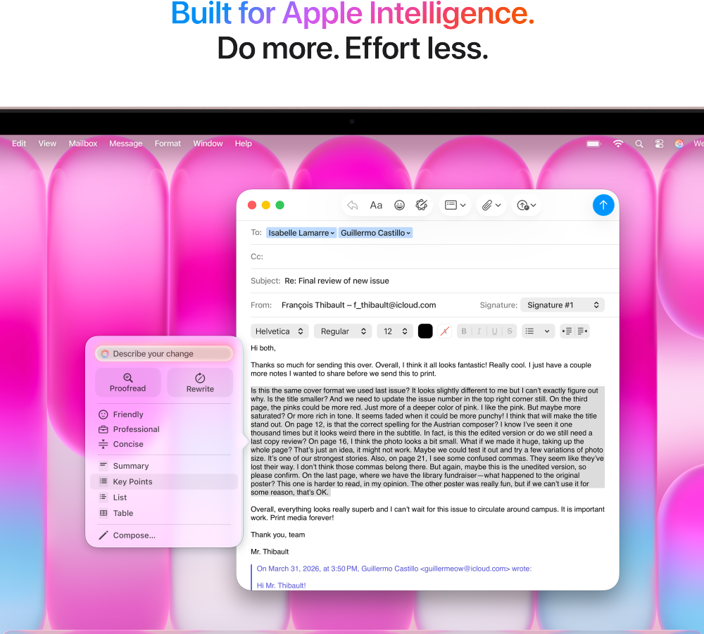 • BYGGD FÖR AI – Apple-chippet och alla de viktiga komponenter som driver det har utformats att köra AI-funktioner effektivt på enheten. Och Apple Intelligence hjälper dig att skriva, uttrycka dig och få saker gjorda på ett enklare sätt – med banbrytande integritetsskydd i varje steg.2